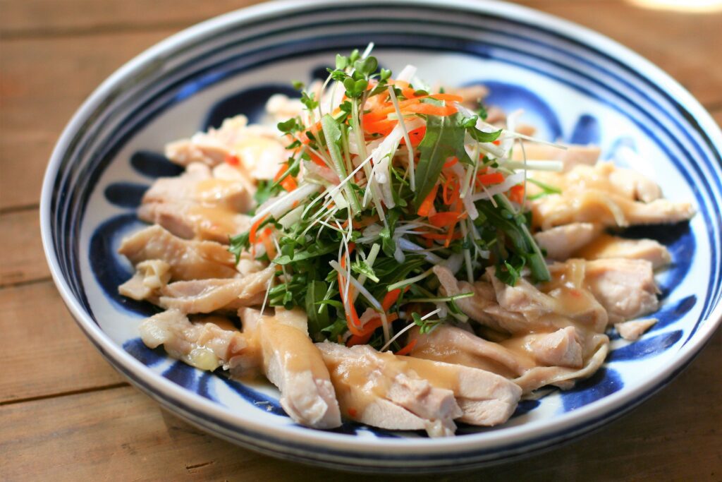 実はこのドレッシング、肉や魚料理のソースとして使うととても優秀です。鶏むね肉を蒸したものや豚肉のソテーなどにかけると、甘みと酸味のバランスが絶妙でさっぱりとした後味に。油が多い食材でも重くならず、果実や香味野菜の香りが食欲をそそります。