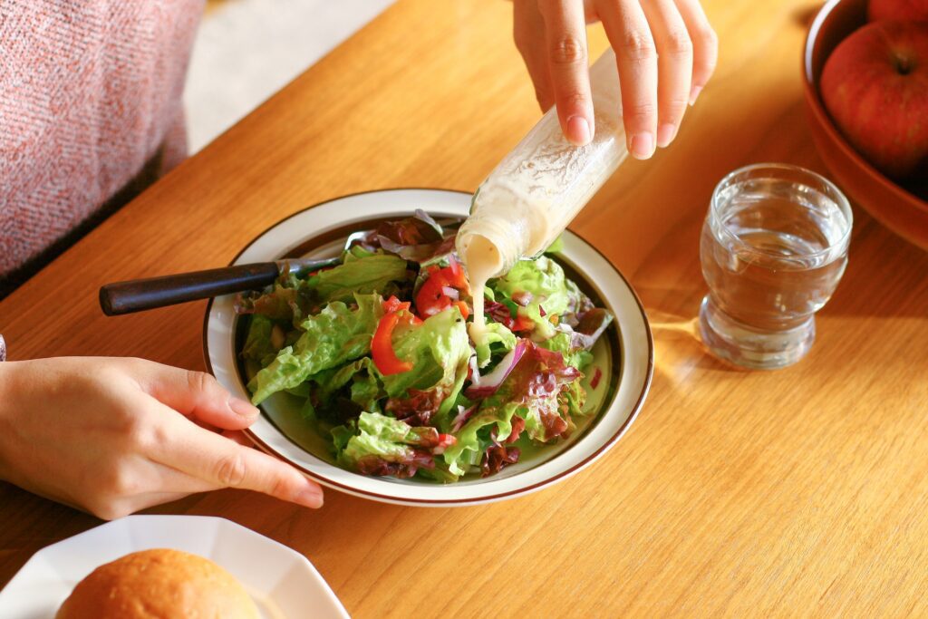 最初に試していただきたいのは、シンプルなサラダとの組み合わせです。レタスや水菜、トマトなどの野菜にそのままかけるだけで、フルーティーな香りがふわりと広がり、一皿の満足度がワンランクアップします。